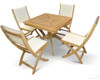 With this Regal Teak Dining Set you will recieve: (4) Teak Folding Sling Dining Side Chairs & (1) Teak 31" Round Root Style Dining Table.
